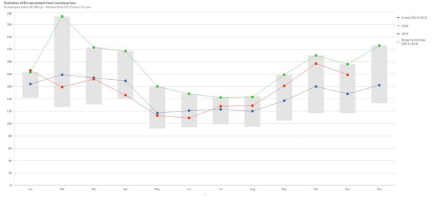 Precios de los tomates de 2024 en la UE en comparación con 2023 y la media quinquenal. La línea roja corresponde a 2024, la línea verde a 2023 y la línea azul a la media quinquenal.