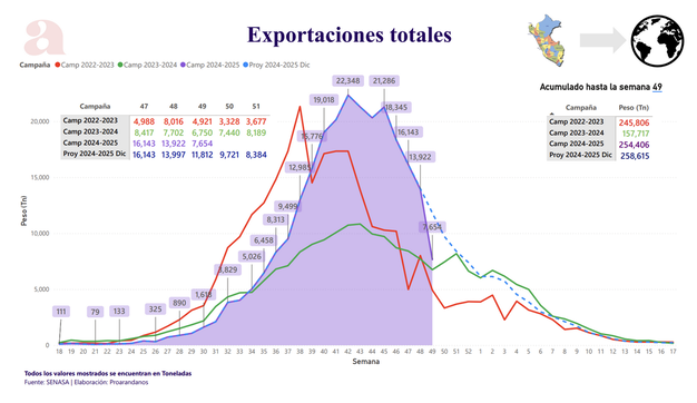 La campaña actual de arándanos en Perú muestra un desarrollo positivo, superando las cifras registradas en la temporada anterior. Hasta la semana 48, se han enviado 245.625 toneladas de arándanos a mercados internacionales, lo que representa un incremento del 63% respecto a la campaña 2023/2024, alineándose con las proyecciones de octubre.