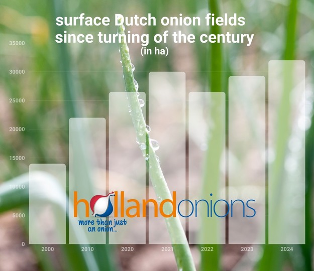 En 2023, la superficie cultivada de cebolla ya casi había recuperado el nivel de 2021. En 2024, lo superará, según cifras provisionales del CBS. Nunca antes se habían producido tantas cebollas de siembra en los Países Bajos como en esta temporada. La superficie ha aumentado casi un 12%. En consecuencia, el rendimiento bruto total ha aumentado en casi un 15% en comparación con la temporada anterior, alcanzando 1,5 millones de toneladas. Se trata del mayor rendimiento jamás registrado.