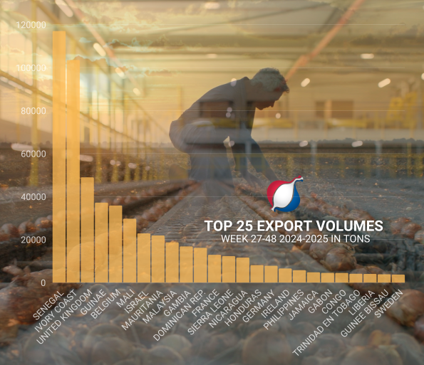 Por ahora no hay grandes sorpresas en el top 3 de la actual campaña de exportación. Senegal encabeza de nuevo la lista con más de 117.000 toneladas, seguido de cerca por Costa de Marfil (103.500 toneladas) y Gran Bretaña en tercer lugar (49.000 toneladas). Costa de Marfil ha logrado una recuperación notable respecto a las mismas fechas de la campaña anterior, en las que "solo" se habían importado 72.000 toneladas. Pese a estar en el tercer puesto, Gran Bretaña también registra un notable descenso. En la última campaña, las exportaciones totales han caído un 13%. Israel ocupa ya la séptima posición, con casi 23.000 toneladas. El país también ha logrado un crecimiento del 53% en la temporada 2023-2024 en comparación con la 2022-2023.