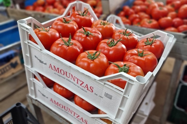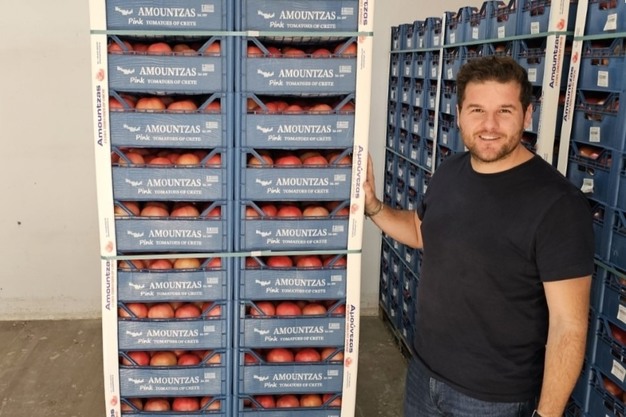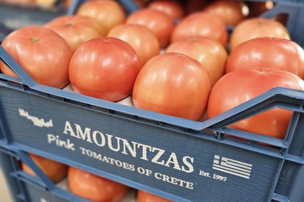 La empresa cretense de envasado y exportación Amountzas inicia la nueva temporada con un nuevo envase especial para sus tomates rosas. "Los tomates rosas han ganado aceptación entre los productores cretenses en los últimos dos o tres años. Se caracterizan por una mayor resistencia al ToBRFV y son muy solicitados en Serbia, Bulgaria, Kosovo y otros países balcánicos. Nos interesa mucho innovar, por eso decidimos presentar nuestros tomates rosas de primera calidad cultivados en Creta en un nuevo envase especial de plástico azul que parece madera y huele a mar", afirma Odysseas Amountzas, propietario de la empresa cretense.