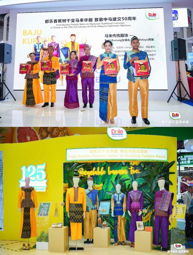 Para conmemorar el 125 aniversario de Dole y el 50 aniversario de las relaciones diplomáticas entre China y Malasia, Dole China dirigió la creación de atuendos tradicionales malayos utilizando tejidos Musa ecológicos derivados de troncos de banana. Estas prendas, que mezclan materiales modernos con intrincados abalorios, como seda, Songkit y otros tejidos, debutaron en la 7.ª CIIE en colaboración con el Pabellón Nacional de Malasia para reflejar el rico patrimonio cultural de Malasia y crear una declaración de moda única y sostenible. Dole también está promoviendo activamente la cooperación con empresas nacionales para introducir este proyecto en la cadena de suministro china.