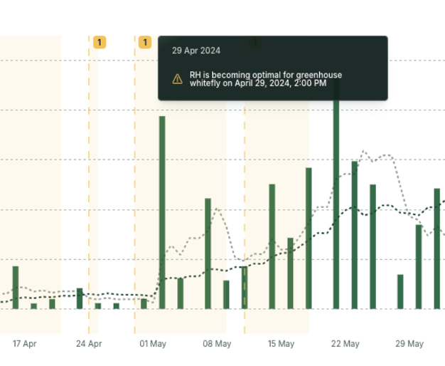 Una de las características más destacadas de SERA Manager es su capacidad predictiva. Un algoritmo propio analiza las condiciones ambientales, como la humedad relativa, para predecir la actividad de las plagas. Una investigación ajena a Koppert Cress reveló que si los niveles de humedad relativa se mantenían en un 45-65% durante más del 30% de las horas diurnas durante al menos siete días consecutivos aumentaban las poblaciones de mosca blanca de los invernaderos en el 90% de los casos analizados. Gracias a este dato y la monitorización continua de SERA, productores como Berecz pueden llevar a cabo intervenciones a tiempo, minimizando la presión de las plagas antes de que se conviertan en un problema importante.