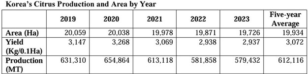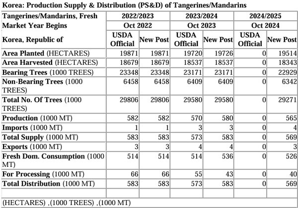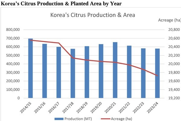 En la campaña 2024/25 (de octubre de 2024 a septiembre de 2025), se prevé que la producción coreana de mandarina alcance las 565.000 toneladas, lo que supone un descenso del 2,6% (15.000 t) respecto a las 580.000 toneladas del año anterior. Esta cifra representa el nivel de producción de cítricos más bajo de la última década y es también un 8% inferior a la producción media quinquenal de 612.000 toneladas. La razón principal de este descenso es la reducción de la cosecha de mandarinas Unshu de campo abierto, que representan aproximadamente el 70% de la producción total de cítricos en Corea, debido a la disminución gradual de la superficie plantada, las condiciones meteorológicas adversas y el fenómeno de la alternancia.