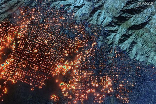 La imagen por satélite de Maxar Technologies muestra cómo el incendio forestal de Eaton ha incendiado casi todos los edificios del oeste de Altadena.