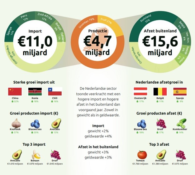 "A pesar de la reducción del consumo interno y de las difíciles condiciones, el sector hortofrutícola holandés ha vuelto a demostrar su resistencia y su sólida posición en el mercado internacional. Eso sí, sigue siendo preocupante que los consumidores holandeses ignoren cada vez más las recomendaciones para una alimentación saludable. El sector mantendrá su compromiso con la producción sostenible, la oferta de opciones saludables y la disponibilidad con el fin de que los consumidores consuman más frutas y hortalizas, que son los alimentos más saludables y con la huella medioambiental más reducida".