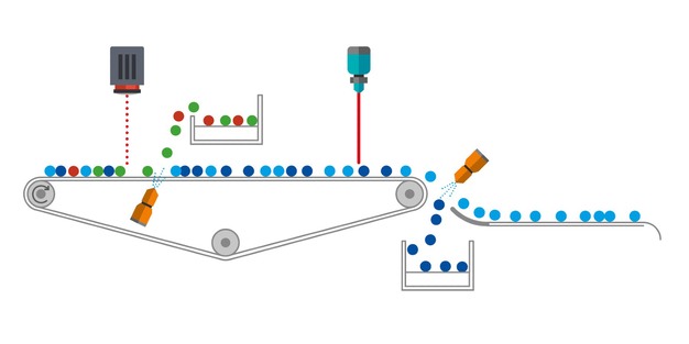 "Los frutos pasan bajo la cámara de escaneado lineal a 1 m/segundo", explica Steve. El proceso de clasificación comienza cuando la cámara detecta colores no deseados en los frutos, como verde o rojo. Los ledes blancos de la máquina, estratégicamente colocados, permiten que la luz incida directamente sobre los arándanos, impidiendo que las sombras se interpongan en la imagen. Esto garantiza una detección precisa de las imperfecciones, incluso de las más pequeñas.