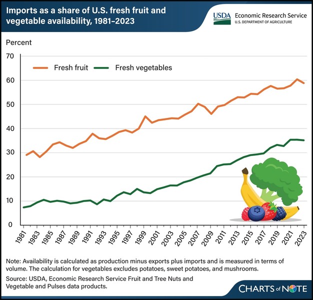 Las importaciones son cada vez más esenciales para garantizar la disponibilidad de frutas y hortalizas frescas durante todo el año en Estados Unidos. Desde que en 2008 se completó la transición al comercio libre de aranceles y cuotas en el marco del Tratado de Libre Comercio de América del Norte (TLCAN), las importaciones de frutas y hortalizas han crecido de forma constante con pocas interrupciones.