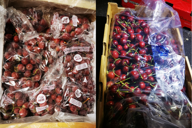 Izquierda: cerezas de Nueva Zelanda. Derecha: ciruelas de Australia.