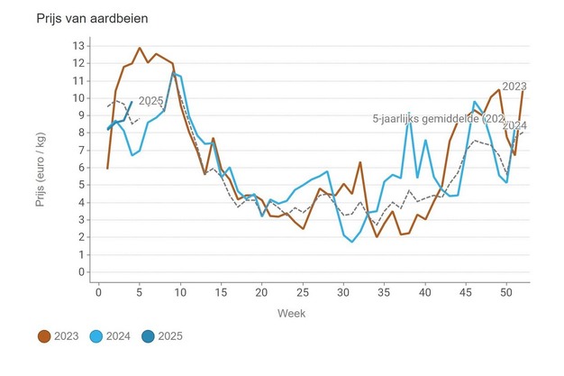 El precio medio de la fresa lleva subiendo desde principios de 2025. Esta tendencia se ha mantenido en la semana 4 y el precio medio se sitúa ahora en 9,84 euros por kilo.