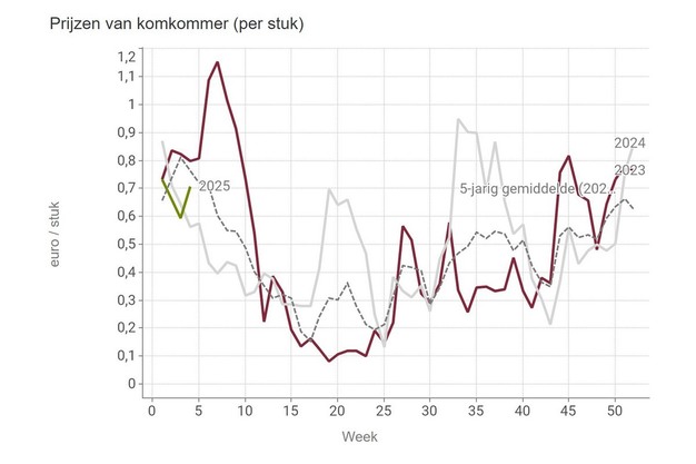 El precio medio del pepino volvió a subir en la semana 4, según VBT. Con algo más de 70 céntimos de euro por unidad, el precio todavía no supera la media quinquenal, tras un comienzo de año muy flojo.