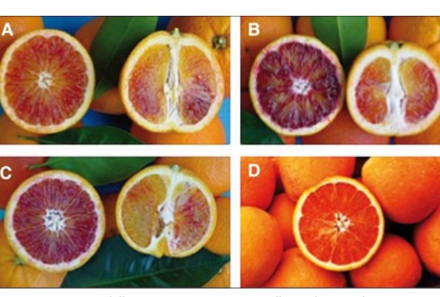 La pigmentación de las naranjas sanguinas, asociada a la producción de antocianinas, afecta por intensidad y distribución a las vesículas y carpelos de los tres cultivares principales (A, Tarocco; B, Moro; C, Sanguinello). En cambio, los naranjas rosáceos debidos a la presencia de licopeno (D, Cara Cara) presentan una coloración uniforme y una tonalidad muy diferente. (Foto G. Russo, CREA-OFA Acireale).