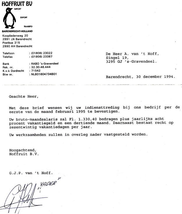 Además de un considerable sueldo inicial de 1.330 florines brutos, también recibió un coche de empresa: ¡un Nissan Micra de tercera mano con un enorme pingüino en el capó! Ningún trato de favor por ser "hijo del jefe". ¡Empezó desde abajo!
