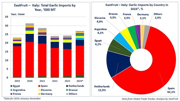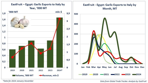 Históricamente, las exportaciones de ajo egipcio a Italia se extendían de marzo a julio, con picos en marzo y abril. Sin embargo, el año anterior, las exportaciones se prolongaron hasta noviembre. Una tendencia similar se produjo en 2024, con una temporada que comenzó en febrero y concluyó en octubre, con picos en marzo, mayo y julio. Los envíos a Italia constituyen alrededor del 8% de las exportaciones egipcias de ajo, por detrás de Taiwán, Polonia y Rusia.