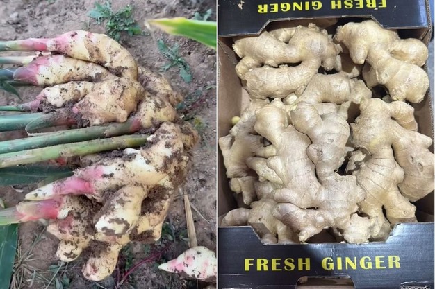 Una vez cosechado, el jengibre se deja secar unas semanas y luego se envía al almacén para limpiarlo, lavarlo y envasarlo. El color rosa indica que el jengibre es joven, y la piel se volverá marrón cuando madure.