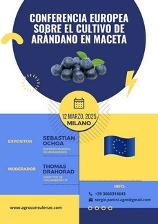 "Se trata de una reunión técnica en la que Sebastián explicará las técnicas de cultivo en maceta, fertilización, riego, crecimiento y cosecha. Disponemos de un servicio de traducción simultánea italiano-inglés-español. Al finalizar la conferencia enviaremos un informe a todos los participantes por correo electrónico. Contamos con algunos patrocinadores 'de oro' que hablarán de sus innovaciones: macetas para arándanos Pasquini y Bini, riego enterrado Ecotube, bioestimulantes Sfera, equipos de recolección Campagnola, riego Netafim. Luego vienen muchos otros patrocinadores 'de plata', todos con espacio expositivo".