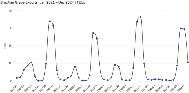 Las exportaciones de uva brasileña en 2024 experimentaron contratiempos de producción debido a las lluvias en el valle de São Francisco (PE/BA) durante el primer trimestre. A pesar de ello, las exportaciones se comportaron bien, con datos de Comex Stat que indican un volumen total de envíos de 58.900 toneladas, lo que supone un descenso del 24% respecto a 2023.