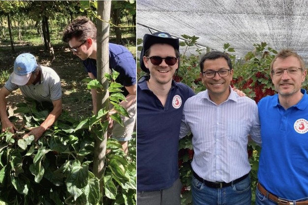 Jan Henrik zum Felde y Stephan Kratzer visitan la plantación del socio productor César Gómez (centro) en Chile.