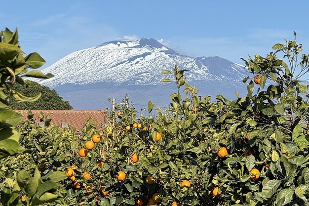 La sede de la empresa con el Etna al fondo.