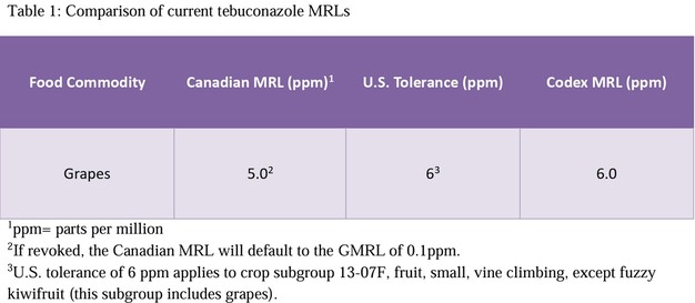 La Agencia Canadiense de Reglamentación del Control de Plagas (PMRA) ha iniciado una consulta sobre una propuesta para revocar el límite máximo de residuos (LMR) de tebuconazol en la uva. De concretarse, el LMR legal de tebuconazol en uvas en Canadá disminuiría de 5,0 ppm al LMR general (LMRG) de 0,1 ppm, aplicable a todas las uvas del mercado canadiense, incluidas las importaciones.
