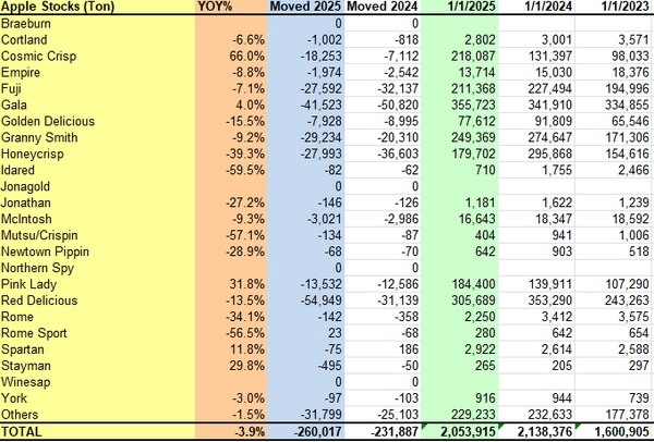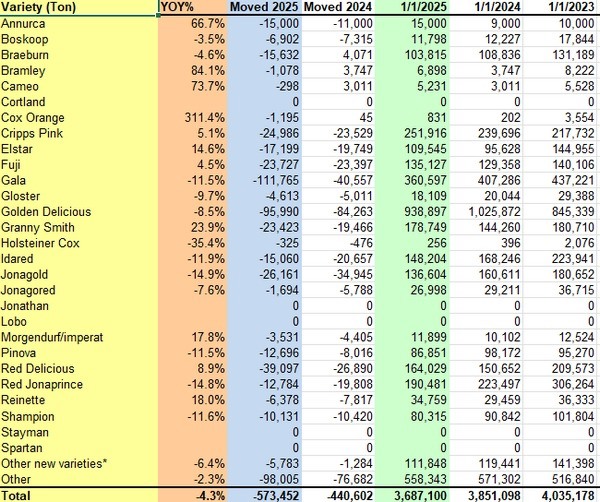 El movimiento total de existencias de manzanas de EE.UU. ha disminuido en 2025 en comparación con 2024, lo que refleja una tendencia generalizada a la baja en la oferta. En concreto, la disminución ha sido de 260.017 toneladas, mayor que la de 231.887 toneladas registrada en 2024. Por tanto, el descenso interanual es del 3,9%, lo que indica posibles limitaciones de la oferta o cambios en la dinámica del mercado. En particular, algunas variedades, como Cosmic Crisp y Pink Lady, mostraron aumentos significativos en el movimiento, mientras que otras como Red Delicious y Fuji experimentaron descensos sustanciales.