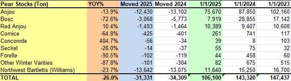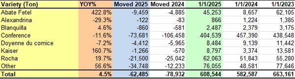 El movimiento total de las existencias de peras de EE. UU. ha disminuido significativamente en 2025 en comparación con 2024, lo que refleja una fuerte contracción de la oferta. La reducción en 2025 ha sido de 31.331 toneladas, ligeramente inferior al descenso de 34.309 toneladas registrado en 2024. Esto representa una disminución interanual del 26,0%, destacando los considerables descensos en variedades clave como Bosc (-72,6%), Comice (-64,8%) y Northwest Bartletts (-23,7%). A pesar de estas reducciones globales, las peras Concorde experimentaron un notable aumento del 404,7%, lo que indica un cambio en la dinámica del mercado.