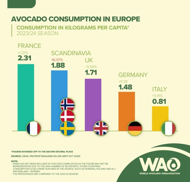 Así pues, si se analiza el consumo per cápita en toda Europa, Francia mantiene su posición de liderazgo con 2,31 kg per cápita. El Reino Unido sigue siendo un fuerte competidor, con 1,71 kg, seguido de Alemania, con 1,48 kg, e Italia, con 0,81 kg per cápita. Mientras que Italia y Francia han mantenido sus niveles de consumo per cápita del año anterior, el Reino Unido y Alemania han registrado un crecimiento destacable, que se atribuye, en parte, a que nuevos consumidores optan por el aguacate.