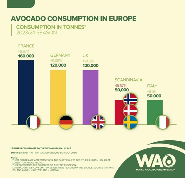 Los últimos datos de consumo de la campaña 2023/24, compartidos por la Organización Mundial del Aguacate (WAO, por sus siglas en inglés), revelan qué mercados europeos se encuentran entre los mayores consumidores de aguacates. En comparación con los datos de 2022/23, países como Francia, Alemania, Reino Unido e Italia han experimentado notables aumentos en el consumo per cápita.