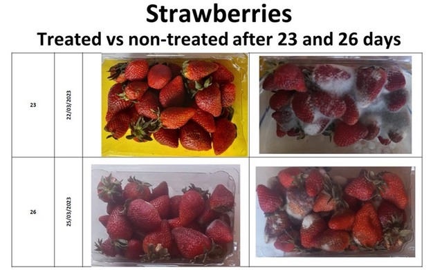Fresas desinfectadas con ozono frente a fruta no tratada: la prevalencia de moho en el grupo de control contrasta fuertemente con la fruta desinfectada.