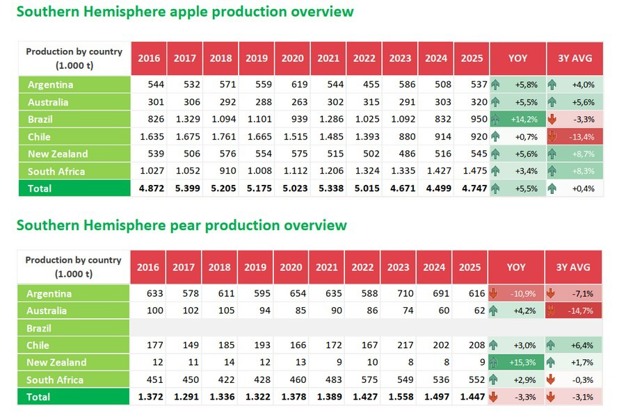 En cuanto a las peras, los productores del hemisferio sur prevén un ligero descenso de la cosecha (-3,3%), con lo que el total ascenderá a 1.446.970 t. Se prevé que Argentina (616.000 t), el mayor país productor, disminuya sus volúmenes en un 10,9%. En cambio, Sudáfrica (551.642 t), Chile (208.025 t) y Australia (62.467 t) aumentarán su producción en un 2,9%, 3% y 4,2% respectivamente. La variedad Packham's Triumph sigue siendo la más producida (601.322 t, a pesar de un descenso del 2,7% respecto a 2024), seguida de las peras Williams' Bon Chrétien (288.729 t). Las cifras de exportación también disminuirán con respecto a 2024, con un total de 689.155 t (-4,4%).