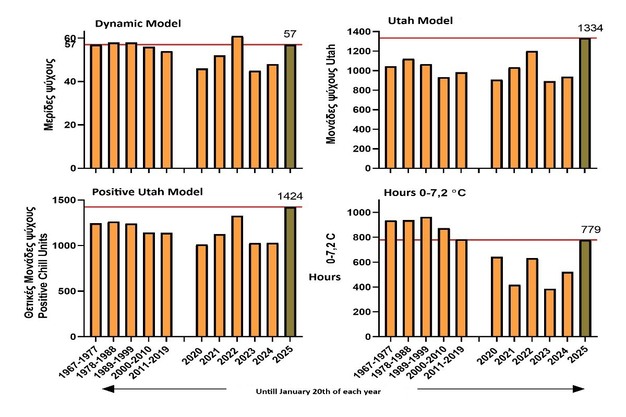 Pavlina Drogoudi, directora de Investigación del Departamento de Frutales de Hoja Caduca del Instituto Griego de Fitomejoramiento y Recursos Genéticos, menciona: "Estamos aproximadamente a mitad del invierno, y la acumulación de horas de frío es similar o superior a la de años 'fríos' anteriores, en los que se observó una producción normal". Los datos visualizados proporcionados por el instituto muestran una mayor acumulación de horas de frío que en temporadas anteriores, según todos los modelos de medición (véase el gráfico).