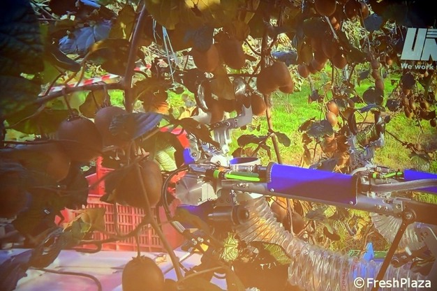 Prueba de recolección robotizada en kiwis (foto tomada del vídeo proyectado por Unitec durante la conferencia).