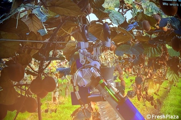 Prueba de recolección robotizada en kiwis (foto tomada del vídeo proyectado por Unitec durante la conferencia).