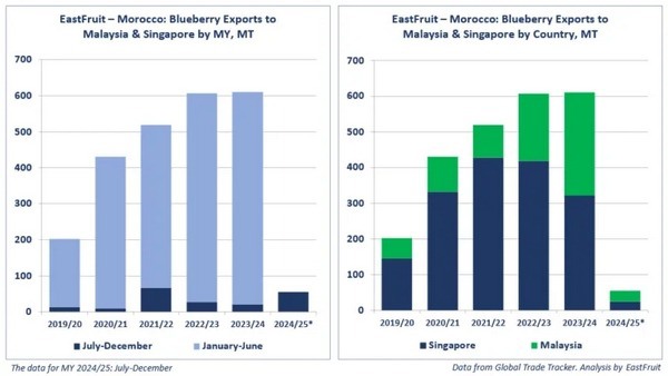 Marruecos está ampliando sus exportaciones de arándanos al sudeste asiático, con 610 toneladas enviadas a Singapur y Malasia en la campaña 2023/24, igualando los resultados de la campaña anterior. La campaña 2024/25 comenzó con 55 toneladas entregadas en diciembre. El seguimiento en Singapur en febrero de 2025 muestra un crecimiento continuo.