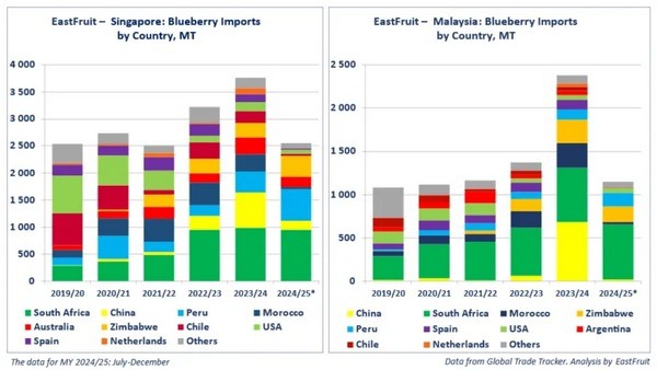 Singapur y Malasia han aumentado las importaciones de arándanos, lo que ofrece oportunidades para exportadores como Marruecos. En la campaña 2023/24, las importaciones de Singapur aumentaron un 16% y las de Malasia un 73%. Marruecos es el tercer proveedor de Malasia y el cuarto de Singapur, después de China, Sudáfrica y Perú.