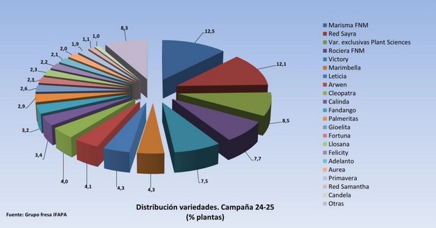 Por su parte, la variedad Red Sayra ha presentado de nuevo una apreciable subida, como ya lo hizo en la pasada campaña. Del 8,1% en 23/24, se estima que ahora supone el 12,1% de las plantas cultivadas, convirtiéndose en la segunda variedad más importante en Huelva.