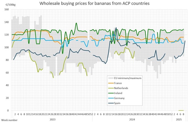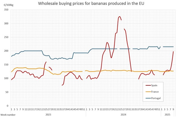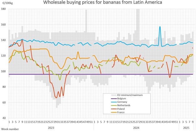En Eslovaquia, el precio por 100 kg pasó de 137 euros en la octava semana a 142 euros en la novena. La subida de 5 euros refuerza la tendencia al alza de los precios de la banana en estos mercados. Los tres países registraron un crecimiento semanal de los precios, según los últimos datos disponibles.
