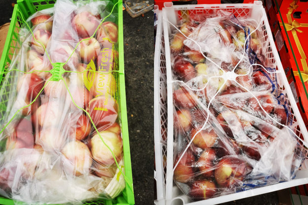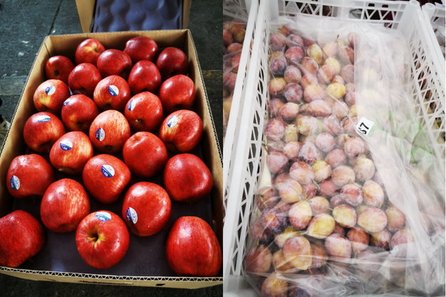 Izquierda: manzanas neozelandesas. Derecha: ciruelas chilenas.