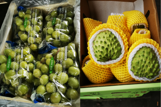 Izquierda: uvas peruanas. Derecha: chirimoyas de Yunnan.