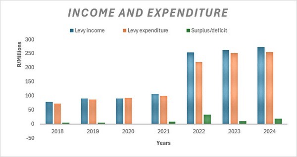 Entre 2018 y 2024, los ingresos por gravámenes en el sector citrícola de Sudáfrica aumentaron una media del 247,85%, lo que refleja un crecimiento significativo de la capacidad financiera para apoyar iniciativas en todo el sector. Estos gravámenes agrícolas obligatorios, aprobados por el Ministro de Agricultura para un ciclo de cuatro años, se utilizan para financiar actividades esenciales para el sector, como la investigación, la transformación y el desarrollo de las exportaciones. Los fondos sobrantes que no se utilicen en un plazo de tres años podrán seguir utilizándose dentro del cuatrienio, previa aprobación ministerial.