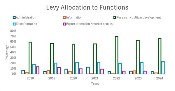 Para 2024, el 66% de los gravámenes recaudados se destinará a investigación y desarrollo de mercados de exportación. La actividad transformadora también recibió un mayor apoyo, con una financiación que pasó del 22% en 2023 al 23% en 2024. Estas inversiones subrayan el papel del gravamen en el impulso de la innovación, el apoyo a nuevas técnicas agrícolas y el avance de las estrategias de control de enfermedades. Además de la investigación y la transformación, los fondos del gravamen se destinan a la administración, la promoción de las exportaciones, el acceso a los mercados y la distribución de información.