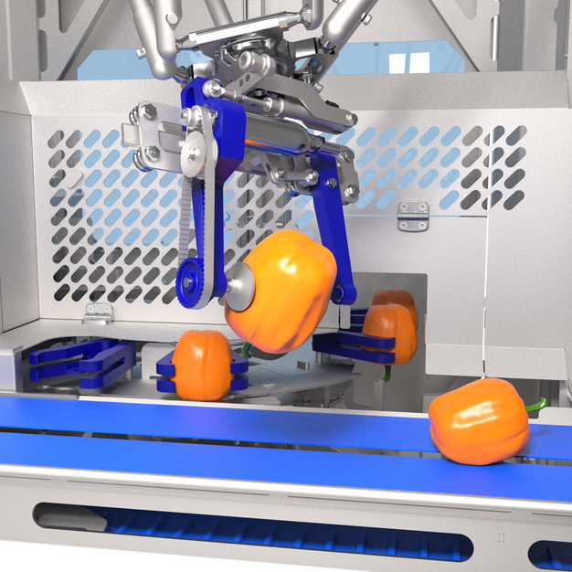 "La PC-55 semiautomática es eficaz y realiza muchas tareas. Ahora lo hemos combinado con la sustitución de mano de obra humana mediante la robotización. Los pimientos se suministran a granel, pero se introducen automáticamente, uno a uno, en la máquina. Utiliza tecnología de visión para comprobar la orientación de la fruta, que el brazo robótico recoge y coloca en la máquina. La máquina quita las semillas y corta el pimiento en la forma deseada: anillos, cuñas o cubos".