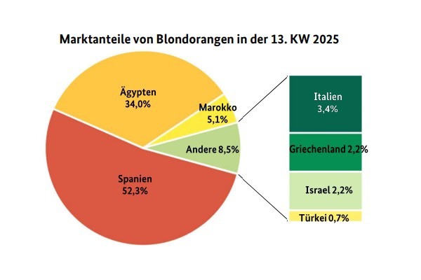 En el sector de las naranjas predominaron las variedades españolas, principalmente Navelate y Lane Late. Las naranjas de zumo Salustiana del mismo origen tuvieron un papel secundario. Las Valencia Late egipcias eran más baratas que la competencia española y también se vendían bien para zumo. Según la BLE, las Washington Navel turcas perdieron notablemente importancia, llegando solo esporádicamente, y en algunos casos ya habían desaparecido del mercado. También disminuyó la presencia de la Salustiana marroquí.