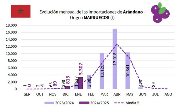 Y es que, como exponen los boletines de seguimiento reforzado de importaciones de terceros países en la UE del MAPA, que esta campaña han incluido a los frutos rojos, abril es el mes en el que históricamente Marruecos alcanza su volumen máximo de exportación, que además está llamado a crecer dada la notable expansión del cultivo de arándanos en el país.