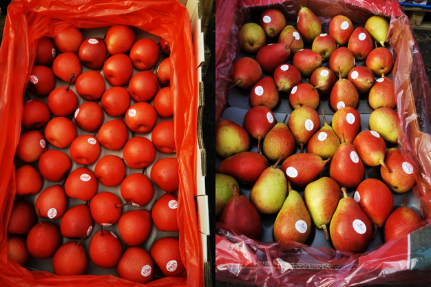 Izquierda: peras rojas de Nueva Zelanda. Derecha: peras de Sudáfrica.
