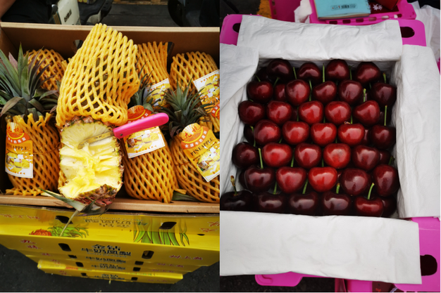 Izquierda: piñas Golden Diamond de Hainan. Derecha: cerezas de Dalian.