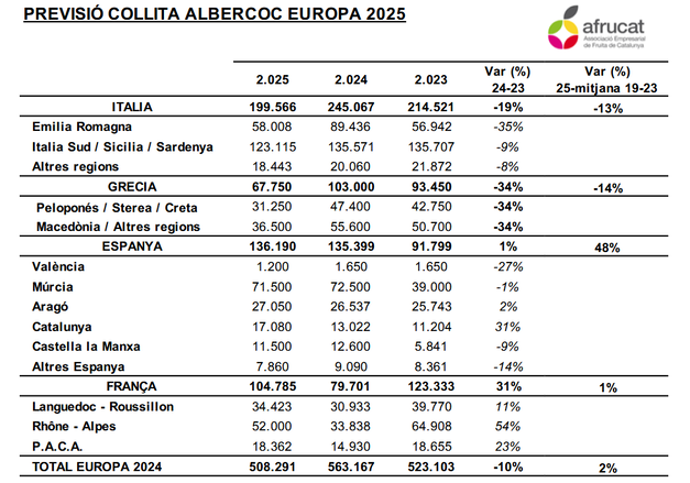 Con un déficit de producción en Italia y, sobre todo, en Grecia, estabilidad en España y una casi vuelta a la normalidad en Francia, la cosecha europea de albaricoques se sitúa un 10% por debajo de la producción de 2024, con 508.000 toneladas previstas, y un 1% por encima de la media 2019-20, según comunica Afrucat.
