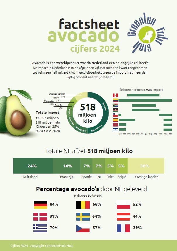 El aguacate es un producto global con un gran valor comercial para los Países Bajos, que son la puerta de entrada en Europa de los aguacates procedentes de ultramar. En los últimos cinco años, las importaciones de los Países Bajos han aumentado un 25%, hasta superar los 500 millones de kilos. En términos monetarios, las importaciones han aumentado en más de un 50%, hasta los 1.700 millones de euros. Estos datos pueden consultarse en la ficha técnica del aguacate de GroentenFruit Huis.