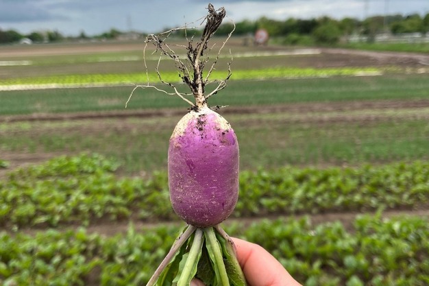 La cosecha de hortalizas de este año comenzó hace unas semanas en Ginsheim, en el sur de Hesse, Alemania, según nos cuenta Kai Reinheimer, de Obst- und Gemüsehandel Reinheimer. Además de espárragos, hierbas aromáticas al aire libre y una gran variedad de lechugas, el agricultor de Ginsheim también ofrece productos especializados como nabos. Este año, sin embargo, por primera vez, la empresa ha plantado la hortaliza en lugar de sembrarla, por lo que los nabos han adquirido una forma alargada en lugar de la redonda habitual. "Seguramente, en el retail no los aceptarían porque no se ajustan a la norma. Sin embargo, como vendemos nuestras hortalizas en el mercado semanal, en tiendas agrícolas y a revendedores, estamos menos sujetos a estos requisitos", señala Reinheimer.