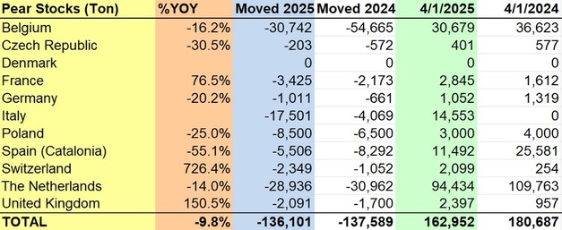 A 1 de abril de 2025, las existencias europeas de pera se situaban en 162.952 toneladas, lo que refleja un descenso del 9,8% respecto a las 180.687 toneladas registradas a 1 de abril de 2024. Esta reducción interanual de 17.735 toneladas es evidente en la mayoría de los principales países productores. España (Cataluña) experimentó el descenso más acusado en términos porcentuales, con una caída del 55,1%, de 25.581 toneladas a 11.492 toneladas. Polonia, Alemania e Italia también registraron descensos del 25,0%, 20,2% y 10.484 toneladas, respectivamente. Los Países Bajos mantuvieron el nivel más alto de existencias, con 94.434 toneladas, aunque ello supuso un descenso del 14,0% respecto al año anterior.